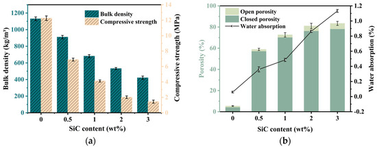 (a) bulk density and compressive strength, (b) porosity and water absorption of samples with different SiC content.