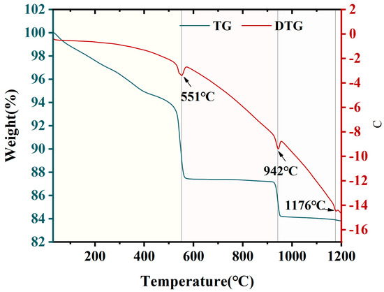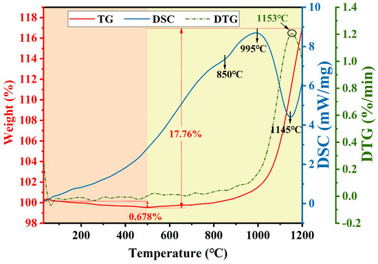 The foaming mechanism of MnO2 is predicated upon a decomposition reaction that takes place at elevated temperatures. This reaction reduces high-valence oxides to low-valence oxides concurrently generating O2 as the gaseous source for the foaming procedure [23]. A thermal analysis was carried out on MnO2 to explore its reaction at high temperatures and to determine the optimum sintering temperature, with the results presented in Figure 11. The mass of MnO2 exhibited a continuous decrease throughout the heating process, accompanied by an exothermic phenomenon, indicating ongoing reactions during the process. The foaming process of MnO2 can be categorized into three stages, two of which are marked by significant mass loss. The first stage occurs within the temperature range of 498 °C to 566 °C, resulting in a weight loss of approximately 6.49%. The corresponding equation is provided in Equation (5) [24]. The second stage occurs within the temperature range of 924 °C to 952 °C and leads to a mass loss of approximately 2.9%. This reaction is delineated in Equation (6). The third stage transpires at approximately 1176 °C, as indicated by reaction Equation (7). During this final stage, minimal mass loss is observed along with a relatively low conversion rate of Mn3O4 formation. Hence, the generation of O2 is sustained throughout all three reactions [28,29,30].