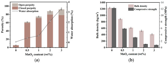 (a) porosity and water absorption, (b) bulk density and compressive strength of samples with different MnO2 content.