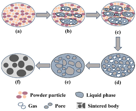 In-situ pore formation of foamed ceramics. (a) Unsintered blank, (b) Formation of a small amount of liquid phase, (c) Formation of a large amount of liquid phase, (d) Pore formation, (e) Pore coalescence, (f) Porous structure.
