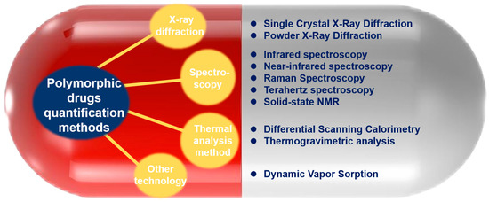 The methodology for quantitative analysis of polymorphic drugs relies heavily on the crystallographic, spectroscopic, and thermodynamic differences between different crystalline forms to be established. Different physicochemical analysis techniques can characterize the different features and properties of drugs. The focus of research at the particle level is the crystal structure, and techniques like thermogravimetric analysis (TGA), differential scanning calorimetry (DSC), and X-ray powder diffraction (PXRD) are frequently employed. Attenuated total reflection infrared spectroscopy (ATR-FTIR), diffuse reflectance Fourier-transform infrared spectroscopy (DRIFTS), near-infrared spectroscopy (NIRS), Raman spectroscopy, solid-state nuclear magnetic resonance (NMR), terahertz (THz) spectroscopy, and other vibrational spectra can be used to characterize the conformation of molecules at the molecular level, as different drug lattice structures frequently result in different conformations [16].