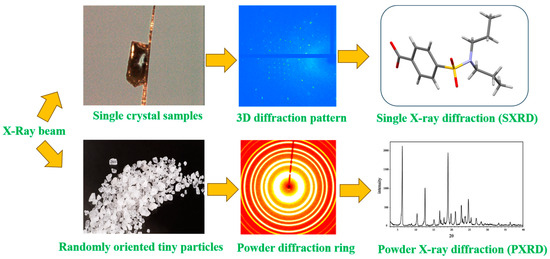 Single-crystal X-ray diffraction (SXRD) is the most accurate and authoritative method to identify the crystalline substance state of a drug, which belongs to the absolute crystallographic identification method. The spatial arrangement of atoms (molecules, ions), structural symmetry, and interaction forces within the crystal structure can be determined by SXRD to successfully identify the crystalline state of a drug [23]. The object of SXRD analysis is only a single crystal, and the principle is to make use of the diffraction effect produced by X-rays on the crystals (Figure 3), and the analytical data represent the results of a certain crystalline type of the pure product. The SXRD method can reveal the cause of the crystalline form of the test article and give various quantitative data on the crystallography of the crystalline substance. By analyzing the single-crystal X-ray diffraction of different crystalline drugs, we can obtain (1) quantitative crystallographic data of different crystalline substances; (2) using the quantitative data of crystalline substances obtained by single-crystal structural analysis, we can obtain the exclusive powder X-ray diffraction patterns and data of pure products of each crystalline substance by theoretical calculation method, which can be used as the control powder diffraction patterns of 100% crystalline purity of various crystalline drugs; (3) using the theoretically calculated powder diffraction patterns of pure products of various crystalline substances; and (4) using the theoretically calculated powder diffraction patterns of crystalline pure products as the basis for crystalline detection, and by analyzing crystalline samples screened or prepared under different experimental conditions to determine the types of crystalline substances and crystalline purity. At present, there are fewer examples of applying the SXRD method alone for the quantitative study of crystalline drugs, and it is usually combined with the results of the PXRD method or other measurement methods for comprehensive evaluation.