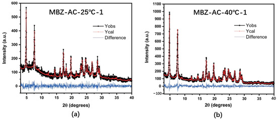 Experimental and calculated PXRD patterns obtained via RM for samples (a) MBZ-AC-25 °C-1 and (b) MBZ-AC-40 °C-1. The Red and black lines represent the calculated and the observed patterns, respectively, and the blue line illustrates the difference between the observed and calculated patterns. [30].