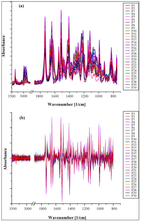 Untransformed (a) and second-derivative (b) ATR-FTIR spectra of samples comprising crystalline RIV, amorphous RIV, and ASDs [47].