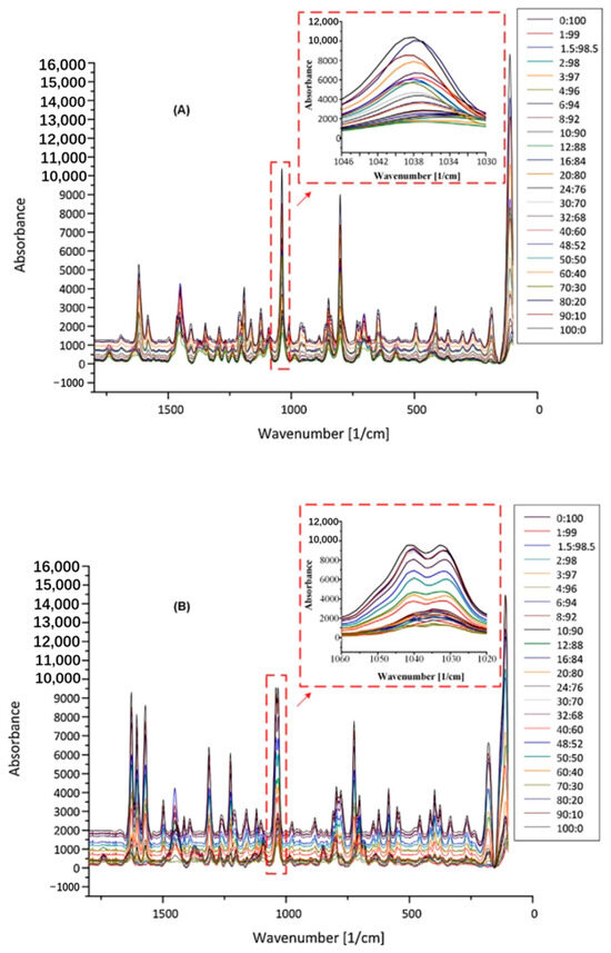 Barmpalexis et al. [79] utilized Raman spectroscopy for the independent quantification of carbamazepine–nicotinamide (CBZ/NIC) and ibuprofen–nicotinamide cocrystals (IBU/NIC) in Soluplus®-based formulations. The spectral peaks of the mixtures of IBU/NIC and CBZ/NIC cocrystals with SOL in ratios ranging from 90/10 to 1/99 w/w were analyzed and modeled using feed-forward, back-propagation artificial neural networks (ANNs) and partial least-squares (PLS) regression analysis. Figure 7 presents the Raman spectra of IBU/NIC (Figure 7A) and CBZ/NIC (Figure 7B) cocrystal mixtures containing SOL at various weight ratios.