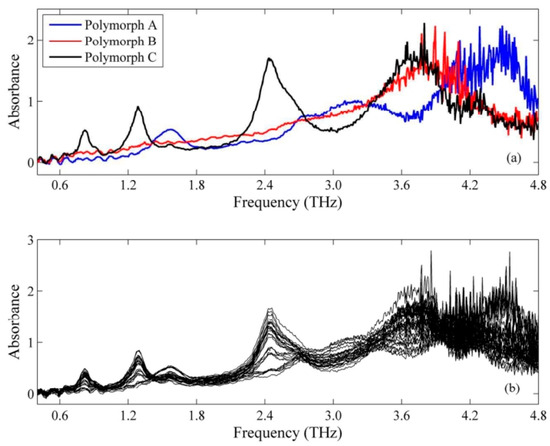 Silva et al. [95] put forward an analytical method founded on terahertz time-domain spectroscopy (THz-TDS) and partial least-squares (PLS) regression modeling for the quantification of mebendazole (MBZ) polymorphs, specifically the crystalline types A, B, and C, in pharmaceutical raw materials. Figure 9a shows the terahertz spectra of MBZ polycrystalline types in the useful range (0.4–4.8 terahertz). The spectral distributions of the different crystalline forms are easily distinguishable, showing clearly distinct absorption bands. Figure 9b shows the terahertz spectra of the sample mixtures used in this study.