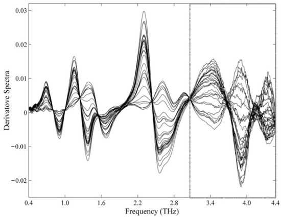 PLS regression models were constructed by utilizing preprocessed terahertz spectra within distinct spectral ranges. Among the preprocessing techniques and spectral ranges that were assessed, the first-order derivatives generated by Savitzky–Golay (SG) filters, with second-order polynomials and 51-point windows, yielded the most favorable outcomes in the range of 0.4–4.4 terahertz (as depicted in Figure 10). The PLS model merely demands two latent variables to account for over 98% of the data variance.