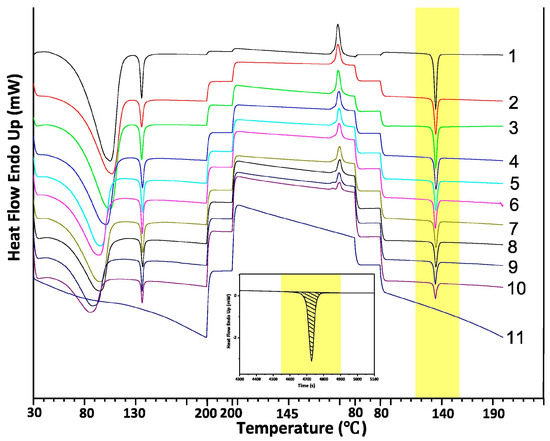 - Ferreira, L.T.; Alarcon, R.T.; Perpétuo, G.L.; Bannach, G. Investigation and characterization by TG/DTG–DTA and DSC of the fusion of Riboflavin, and its interaction with the antibiotic norfloxacin in the screening of cocrystal. J. Therm. Anal. Calorim. 2019, 136, 581–588. [Google Scholar] [CrossRef]