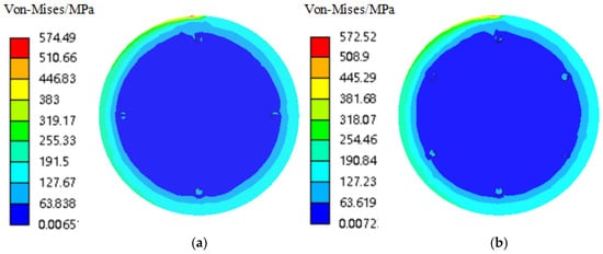 Equivalent stress cross-section diagram. (a) Ordinary continuous casting roller. (b) New continuous casting roller.