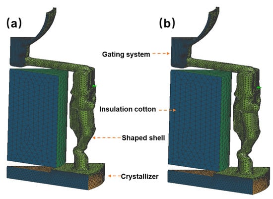 Schematic diagram of solidification simulation results under two model structures: (a) conventional model; (b) new model. The arrows pointed out the important position of the model of the as-cast structure.