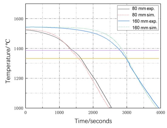 According to the Cellular Automaton (CA) model described by CA. Gandin et al. and the KGT model described by Kurz, Giovanola, and Trivedi et al. [22,23], grain growth simulation is based on the temperature field calculation to ensure the accuracy of the interface parameter setting in the simulation process. The simulation temperature data of 80 mm and 160 mm two points are extracted, sorted out, and fitted with the measured temperature curve. The fitting results are shown in Figure 2. The simulated temperature curve and the experimental temperature measurement curve fit well, and the interface parameter setting is basically in line with the actual experimental situation. The thermophysical properties of DD5 alloy materials were calculated by ProCAST 2019 software, and the DD5 liquid phase temperature TL = 1387 °C was obtained. The solid-phase temperature TS = 1333 °C is almost the same as reported before [4].