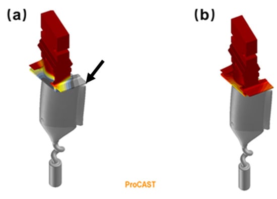 The simulation results are shown in Figure 5. The junction between the leaf body and the mortise edge plate under the conventional model was solidified first when the solid-phase rate reached 29%. Then the edge plate area pointed by the black arrow in Figure 5a also begins to solidify gradually. At this time, the subcooling of the area where the edge plate has not yet started to solidify in Figure 5a is close to the critical nucleus subcooling of the alloy itself at 33 °C [13]. Then spontaneously nucleated, in the directional solidification, from refined grains to edge plate heterocrysts, and along the edge plate lateral distribution growth. Figure 5b shows the solidification results of the edge plate of the new model under the same solid-phase rate. It can be seen that because the solidification interface is relatively stable, the junction between the leaf body and the edge plate solidifies sequentially and steadily advances to the leaf body edge plate part, so there is no phenomenon of local continuous supercooling of the edge plate shown in Figure 5a and the phenomenon of hetero-crystals.