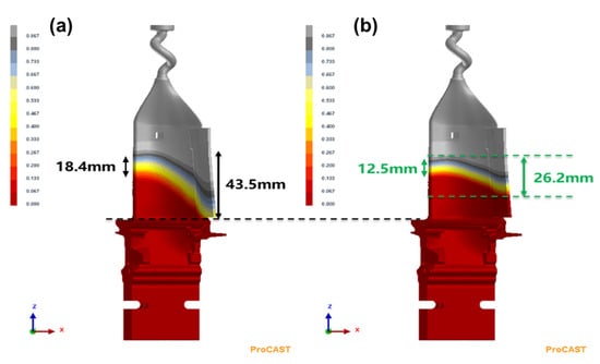 Figure 6 shows the solidification interface of the two models. The height difference of the liquid–solid interface at the air intake edge of the blade body is 18.4 mm and 12.5 mm, respectively. Compared with the conventional model, the longitudinal temperature gradient in the directional solidification process of the new model is relatively large. The width of the paste zone is narrow, and the solidification interface is relatively stable.
