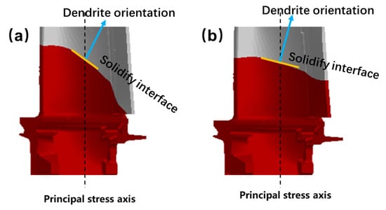 - As the solid-phase fraction of the two is 18%, the height difference between the liquid–solid interface of the conventional model and the new model of the blade is 43.5 mm and 26.2 mm, respectively, indicating that the longitudinal temperature gradient of the new structural model is large. The paste area of the liquid–solid interface is narrower, and the solidification interface is more stable, resulting in a small axial declination angle between the primary dendrite growth direction and the principal stress. The average value of the primary dendrite orientation is about 6°, and the mechanical properties of the casting can be effectively improved.
