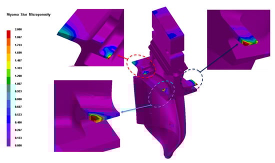 Figure 8 shows the micro-loosening distribution map in the blade under the preferred new model structure. The solidification interface is relatively stable under the new model structure. The micro-looseness begins to distribute and aggregate at the sharp corners of the edge plate when the solidification interface is pushed to the end face of the edge plate. After the sharp corners of the end face of the edge plate are solidified, the dendritic channels of the dense staggered dendrite channels hinder the shrinkage of the liquid metal, resulting in the loose display of the sharp corners of the end face of the edge plate. Due to the good solidification conditions of the material under the new model, there are very few defects in the blade position, and only some defects are found in the unimportant parts of the ends.
