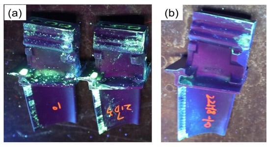 Figure 9 shows the physical fluorescence loosening display of the casting. The loose simulation structure is basically consistent with the physical fluorescence display results. As can be seen from Figure 9, the fluorescence on the surface of the single-crystal blade prepared according to the conventional model is very large, and it is almost all over the blade. However, the fluorescence in the single-crystal blades fabricated by the novel model is very low and mainly distributed at the ends. Samples with low fluorescence have few surface defects and are not prone to crack formation during subsequent service, which can improve the service life of the blade.