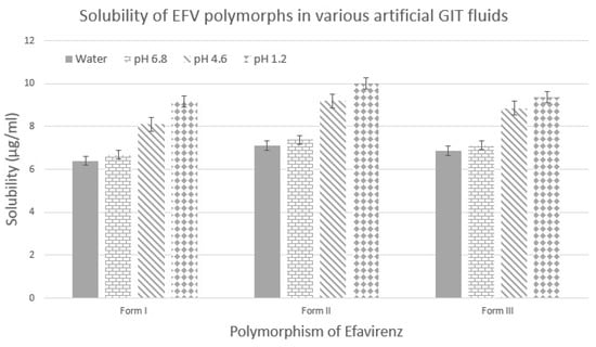 The resulting polymorphs exhibited varying solubility abilities in water and different GIT. As shown in Table 1 and Figure 2, Form II had the highest content among the selected polymorphic solubilities in each artificial GIT fluid. Additionally, the metastable form of EFV had more solubility, which was observed in Form II, with a better solubility increase of up to 13.24%. In contrast, Form III reached 9.18% in the same solvent (artificial gastric fluid) at a pH of 4.6. For Form II, the increase in solubility was greater than for Form III, with an increase range of 9.37–13.24 % at various pH values.