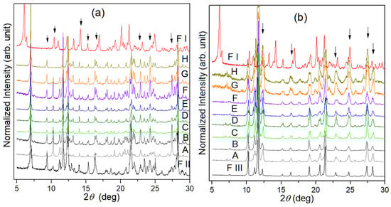 Changes (arrows indicate peak changes that occur) in the X-ray diffraction patterns of EFV metastable polymorphs (a) Form II, (b) Form III under soak at various artificial GIT fluids; A. Water in 10 h; B. Water in 100 h; C. Buffer pH 6.8 in 10 h; D. Buffer pH 6.8 in 100 h; E. Buffer pH 4.6 in 10 h; F. Buffer pH 4.6 in 100 h; G. Buffer pH 1.2 in 10 h; H. Buffer pH 1.2 in 100 h.