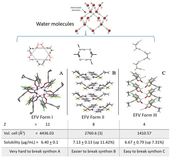 According to CCDC data of EFV polymorphs for which Forms I, II, and III have pattern matches with the database at disposition numbers 767883, 758360, and 728655, the database being identified is termed AJEYAQ01, AJEYAQ, and AJEYAQ02, respectively. The polymorphic forms of alterations in molecular packing have only small modifications, with an orthorhombic shape overall but variations in the Z value, space group, and cell volume [21]. This is one of the building blocks that can account for polymorph solubility discrepancies. While supramolecular synthon bindings change amongst polymorphs, Form I exhibits the stiffest and tightest synthon bonds when compared to the polymorphic forms of Forms II and III. This situation appears to better explain the ability of EFV to dissolve in polymorphic modifications. Furthermore, the intermolecular conformation model shows that Form III has a little gaps as compared to Form II due to its resistance to ionic circumstances. Meanwhile, Form I is a stable form that is difficult to penetrate beneath both hydrogen bonding and ionic environments. Apart from the obvious information, the structural lattice is portrayed with tight gaps between molecules, which is further confirmed by the cell volume and Z value of each form, with Form III having the smallest cell volume and Z value.