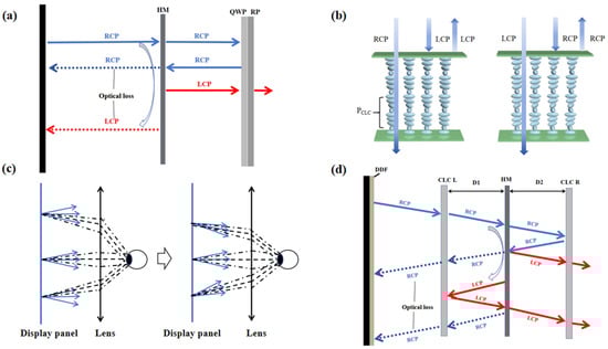 In this paper, CLC and DDF were simultaneously integrated into the pancake system, where they enhanced the coupling efficiency from the screen to the optical system and the coupling efficiency from the optical system to the detector or human eyes, respectively. The optical paths are shown in Figure 1d.