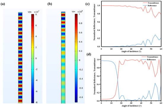 (a) Right-hand circular polarization incident on the structure. (b) Left-hand circular polarization incident on the structure. (c) Transmission and reflection spectra of the incident right-hand circular polarization light. (d) Transmission and reflection spectra of the incident left-hand circular polarization light.