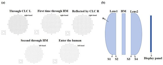 All the lenses were assumed to be thin lenses to reduce the computational complexity. The basic parameters of the dual-lens system are shown in Figure 3b. n is the refractive index of the CLC material. Lens 1 is the lens closer to the human eye, with S1 and S2 as its two surfaces; S1 is the curved surface and S2 is flat, and the curvature of S1 is denoted as C1. Lens 2 is the lens close to the screen; S3 and S4 are the two faces of Lens 2; S3 is flat, and S4 is curved, and the curvature of S4 is denoted as C1, where C1 = −C2.