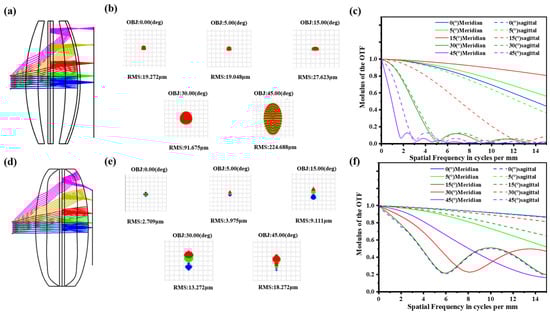 The RMS radius and the MTF curve of the optimized system are shown in Figure 4e,f. The MTF curves for each field of view after optimization were greater than 0.2 at the maximum spatial frequency (15 lp/mm), the RMS radius was smaller than the pixel size of the image source for small fields of view, and the RMS radius was larger for large fields of view; this is because the edge fields of view were assigned a lower weight in the optimization process.