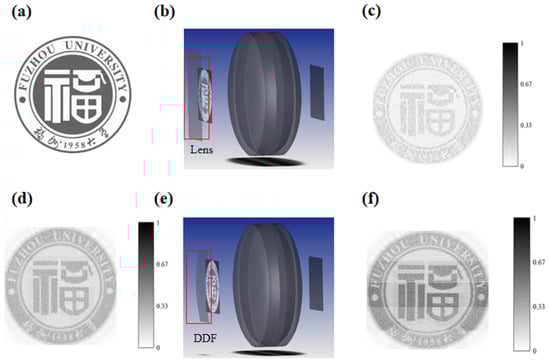 The essence of DDF is a PB phase lens with different focal lengths in three regions. In ZEMAX non-sequential mode, the lens is divided into three regions, and the DDF is simulated by setting different focal lengths for each region, as shown in Figure 5e. The light tracing was performed using the added rectangular detector, which serves to monitor the energy of the transmitted light to assess the optical efficiency. A slide was placed between the screen and the CLC lenses to simulate imaging. Figure 5a shows the original input image of the slide, and the display light was set to 0 in the structural image for a clearer view of the structure, as shown in Figure 5b [32,33,34,35,36,37].