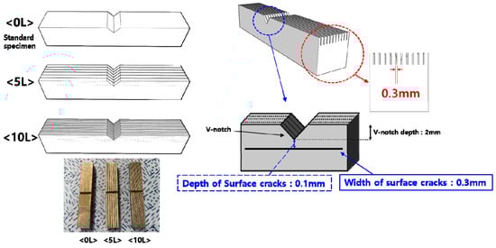 Schematic design of the Charpy impact test specimen with surface-cracking (5 L, 10 L) used in this study.
