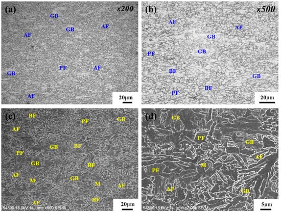 Microstructure of X80 steels obtained from OM (a,b) and SEM (c,d) at different magnifications.
