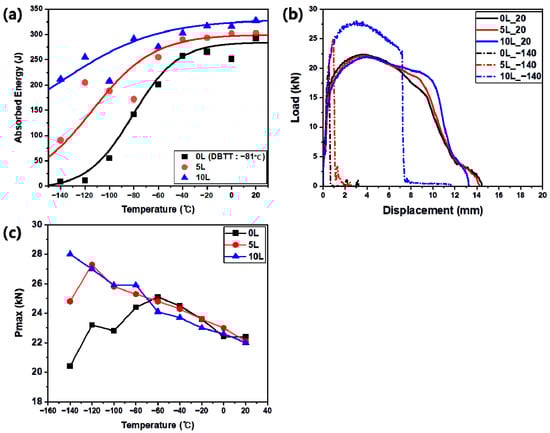 The absorbed energy as a function of the test temperature curves, load–displacement graphs, and Pmax obtained from the instrumented Charpy impact test from room temperature to very low temperatures: (a) absorbed energy, (b) load–displacement graphs, and (c) maximum load (Pmax) from the Charpy impact test.