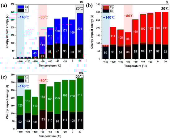 In contrast, the 5 L and 10 L specimens demonstrate significantly higher Ei values, approximately 90 J, indicating a considerable improvement in energy absorption capacity. At −140 °C, the 5 L specimen exhibits a noticeable decrease in overall impact energy, primarily due to a sharp decline in Ep to around 11 J, despite maintaining a relatively high Ei value of approximately 80 J. This suggests that while the 5 L specimen retains its ability to initiate cracks, its crack propagation resistance is severely compromised under these conditions. On the other hand, the 10 L specimen maintains both high Ei and Ep values even at −140 °C, underscoring its superior ability to resist crack growth and maintain high impact toughness at extremely low temperatures.