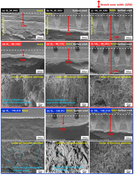 The fracture surface of X80 steels with the surface-cracking process applied around the notch and center of the impact-fractured specimen at various temperatures: (a–c) 20 °C, (d–f) −80 °C, and (g–i) −140 °C.