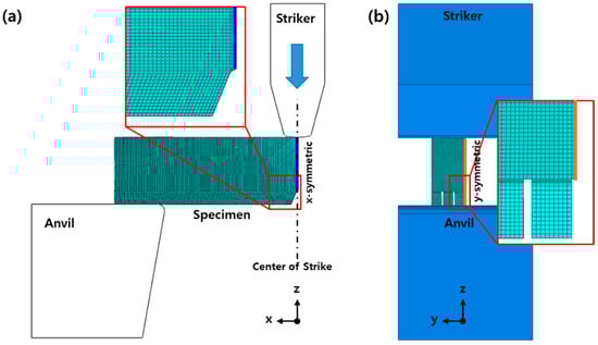 Schematic diagram (5 L) of the 1/4 FE model for CVN impact testing at room temperature of high-strength steel in this study: (a) front view and (b) side view.