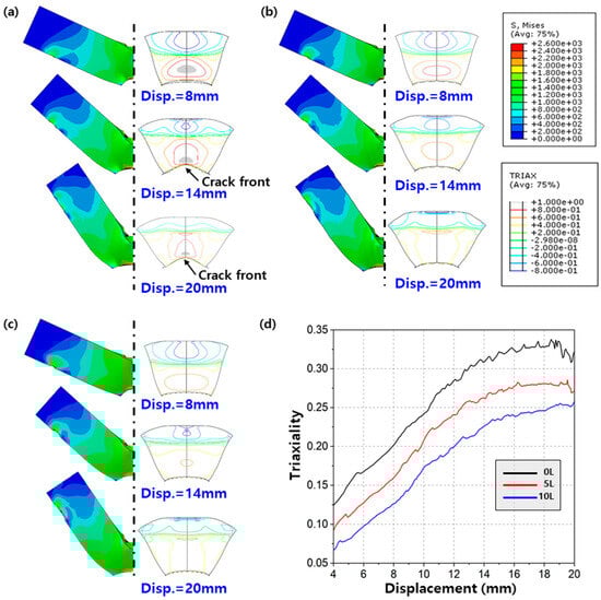 Finite element analysis results for deformation (top view) and triaxiality distribution (cross-section view) according to changing displacement (8 mm, 14 mm, 20 mm) for the Charpy impact specimens caused by surface cracks: (a) 0 L, (b) 5 L, and (c) 10 L sample and (d) average triaxiality.