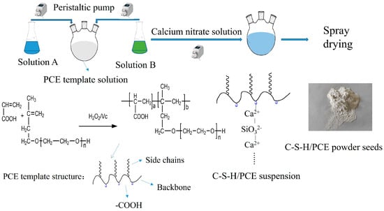 A diagram of the preparation mechanism of the template and powder seeds is presented in Figure 1. The PCE template with a comb structure was synthesized through aqueous polymerization, in which calcium ions and silicate ions were successively adsorbed on the carboxyl group to form a C-S-H/PCE suspension.