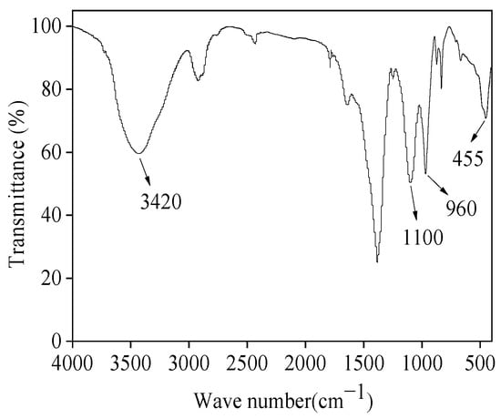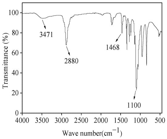The FTIR spectrum of the synthetic template is displayed in Figure 2. In this figure, the peak at 3471 cm–1 represented the hydroxyl group characteristic peak in the PCE template. The stretching vibration peak at 2880 cm–1 was attributed to the methyne group [46,47]. The bending vibration peak at 1468 cm–1 was determined as the -CH2 group [46]. The characteristic adsorption band of the ether linkage corresponded to the peak at 1100 cm–1 [47].