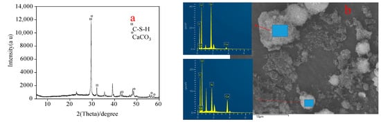 Figure 7 presents the XRD and SEM images with EDS of the C-S-H/PCE powder nucleating agents. The XRD patterns revealed that in addition to the C-S-H gels, carbonized calcium carbonate was present in the powder seeds. As illustrated in Figure 7b, the synthetic powder seeds were mainly spherical and irregular C-S-H gels. In addition to silicon, calcium, and oxygen, these spherical and amorphous C-S-H gels also contain carbon. Part of this carbon was derived from the PCE template, and the other part was derived from the carbonization of the powder seeds by air, which was consistent with the XRD patterns.