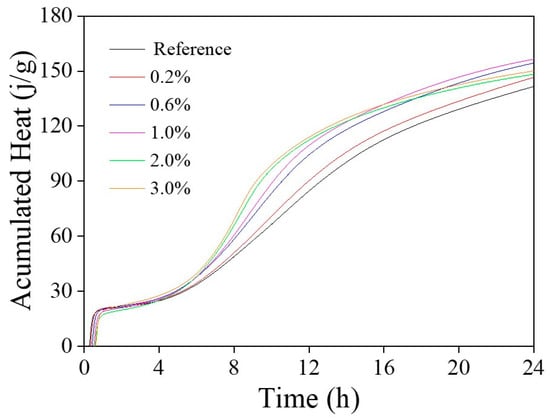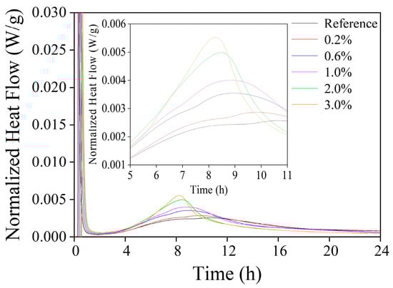 The effects of different dosages of powder seeds (0.2%, 0.6%, 1%, 2%, and 3%) on cement hydration heat within 24 h are shown in Figure 8 and Figure 9. For the reference sample, the second exothermic peak occurred at 10.9 h, with a heat release rate of 0.0025 W/g and a total heat release of 141.6 J/g over 24 h. Upon the addition of powder seeds, the second exothermic peak appeared progressively earlier, and the maximum heat release rate increased gradually, whereas the total heat release over 24 h remained unaltered.