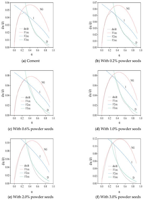 Figure 10 shows the fitting curves of the hydration reaction rate with various contents of powder seeds. The control group, without the addition of powder seeds, conformed to the multiple reaction mechanisms described by Krstulovic-Dabic [43,49]. By examining the relationship between the fitting equation curves and the corresponding α-curve in dα/dt, it was observed that cement pastes containing powder seeds exhibited better alignment with the NG process, with reduced deviation. Conversely, for the phase interface (I) process, the deviation increased as the concentration of powder seeds increased. In the diffusion (D) process, the fitting results remained relatively accurate, although slight variations were observed with increasing the seed dosage.