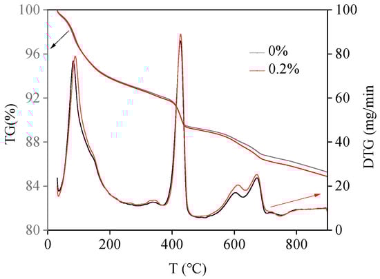 Figure 11 shows the thermogravimetric curves (TG/DTG) of the cement pastes at 1 day. The first endothermic peak in the range of 30 °C to 200 °C corresponded to the evaporation of free water from hydrated calcium silicate gel [51]. The second endothermic peak occurred at about 420 °C and was correlated with the decomposition of calcium hydroxide [41,48]. The third peak, which appeared at 600–750 °C, was attributed to the decarbonation of calcite [52]. At the second peak, the peak value of the sample with 0.2% powder seeds was greater than that of the reference group, and its total mass loss was also greater. This indicated that the nucleation role of powder seeds promoted the degree of cement hydration.