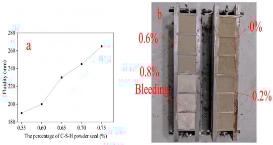 The powder seeds, synthesized with a polycarboxylate superplasticizer as a template, exhibited a water-reducing effect, necessitating the evaluation of their impact on cement paste fluidity. The influence of different dosages of powder seeds on paste fluidity is depicted in Figure 12. As shown in Figure 12a, paste fluidity progressively increased with increasing dosage of powder seeds. At a concentration of 0.55%, the paste achieved a fluidity of 190 mm, whereas at 0.75%, the fluidity increased to 265 mm. However, when the dosage reached 0.80%, a bleeding phenomenon was observed in the cement paste, indicating excessive water content and separation (Figure 12b).