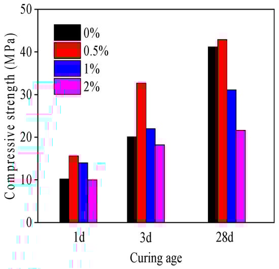 At a dosage of 1%, the 1-day and 3-day strengths exceeded those of the reference groups, but the strength at 28 days was slightly lower. When the dosage was increased to 2%, the compressive strengths at all curing ages were lower than those of the reference sample. This decline was linked to the bleeding phenomenon caused by the water-reducing effect of the powder nucleating agents, which disrupted the integrity of the samples.