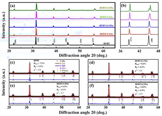 (a) XRD analysis of BFBT:wt%Sn with wt% = 0–0.25 ceramics, (b) broadened XRD analysis of BFBT:wt%Sn with wt% = 0–0.25 ceramics for 2θ = 36–48°, and XRD simulation analysis of (c) pure BFBT, (d) BFBT:0.15Sn, (e) BFBT:0.2Sn, and (f) BFBT:0.25Sn.