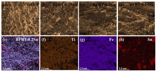 Morphological analysis of (a) BFBT, (b) BFBT:0.15Sn, (c) BFBT:0.2Sn, and (d) BFBT:0.25Sn; (e) detailed elemental distribution of the BFBT:0.2Sn ceramic; and elemental distribution of (f) Ti, (g) Fe, and (h) Sn.
