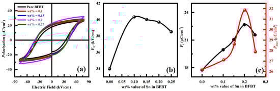 (a) Ferroelectric P-E loop analysis of BFBT:wt%Sn with wt% = 0–0.25 ceramics, (b) coercive electric field versus wt% values of Sn in BFBT ceramics, and (c) Pmax and Pr values as a function of the wt% values of Sn in BFBT ceramics.