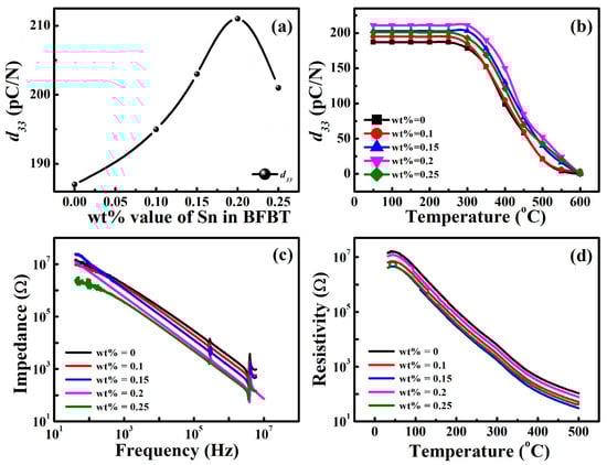 (a) The piezoelectric coefficient d33 as a function of the wt% values of the Sn in BFBT ceramics, (b) the piezoelectric coefficient d33 thermal stability against the annealing temperature range of 50–600 °C of BFBT:wt%Sn with wt% = 0–0.25 ceramics, (c) the impedance versus frequency response of BFBT:wt%Sn with wt% = 0–0.25 ceramics, and (d) resistivity versus temperature plots of BFBT:wt%Sn with wt% = 0–0.25 ceramics.