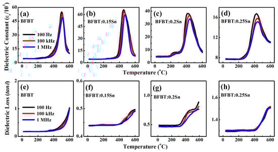 The dielectric constant versus temperature (εr vs. T) plots for analyzing the stability of the ceramic compositions and their Curie temperatures are presented in Figure 5a–d. The εr vs. T plots are measured for the 15–600 °C temperature range and varying frequencies of 100 Hz, 100 kHz, and 1 MHz. Figure 5a is a presentation of the typical ferroelectric sharp εr vs. T peak at a TC of ~510 °C. As the Sn content is varied, the dielectric constant curves, as a function of the temperature, start to broaden and the frequency is dispersed around their TC values, indicating the relaxor behavior of the ceramics [36]. This transformation from true ferroelectric to relaxor ferroelectric is associated with the existence of induced polar nanoregions (PNRs) and the structural heterogeneity of the BFBT host matrix created due to the Sn addition [37]. Such PNRs are formed due to the fluctuation of dipoles at the nano-level, which causes the amplification of the piezoelectric response (evident from Figure 4a) [38]. There also comes a gradual decrease in the value of TC with the variation of the Sn content; for the BFBT:0.15Sn, BFBT:0.2Sn and BFBT:0.25Sn ceramics, the values of TC are 480 °C, 445 °C and 433 °C, respectively. Figure 5e–h present the dielectric loss versus temperature (tanδ vs. T) plots, and the measurement has demonstrated the low dielectric loss of 0–1 even at the high temperature of 400 °C. The dielectric constant and dielectric loss information of the BFBT:0.1Sn ceramic is presented in SI Figure S3. This strong dielectric stability can be associated with the high density of the ceramic materials, along with the low charge defect concentration, consistent with previously reported rare-earth-modified BFBT ceramic systems [18]. Finally, for the better understanding of presented study, the outcomes are compared with the literature (Table 2), it will provide the better significance of our work for the high-temperature piezoelectric devices.