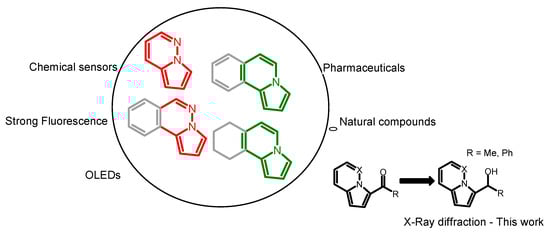 Our ongoing interest in the synthesis and properties of N-bridgehead heterocycles [12,13,14,15,16] with a large variety using the 1,3-dipolar cycloaddition approach led us to obtain large libraries with applicative potential and with examples both from materials and from the bioactivity range. One example is indolizines or benzoindolizines and their diaza analogues (Figure 1). However, to increase structural diversity with the aim of obtaining new compounds with new properties, we functionalized these structures further by obtaining new hydroxyl derivatives (Figure 1).