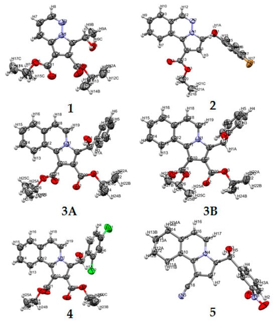 ORTEP diagrams for compounds 1–5 with thermal ellipsoids at 50% probability.